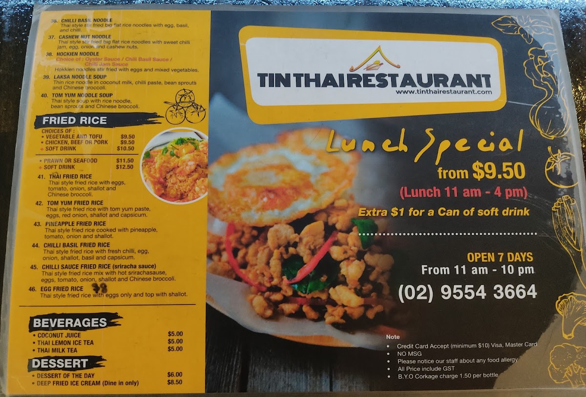 Welcome to Tin Thai Restaurant, a hidden gem nestled at 237 Kingsgrove Rd, Kingsgrove, NSW. This culinary haven offers an impressive array of authentic Thai dishes, perfect for any food lover. Customers rave about the extensive lunch menu, packed with flavorful options and great deals.